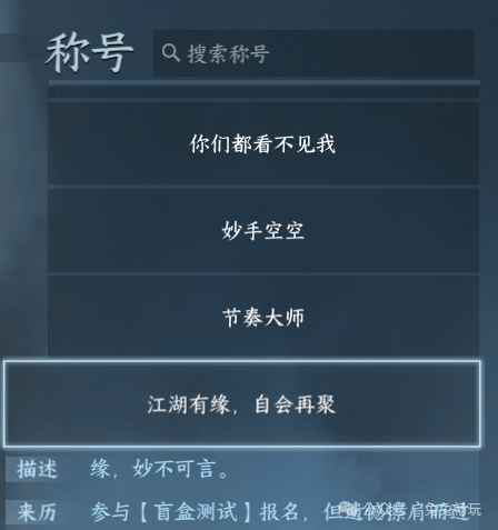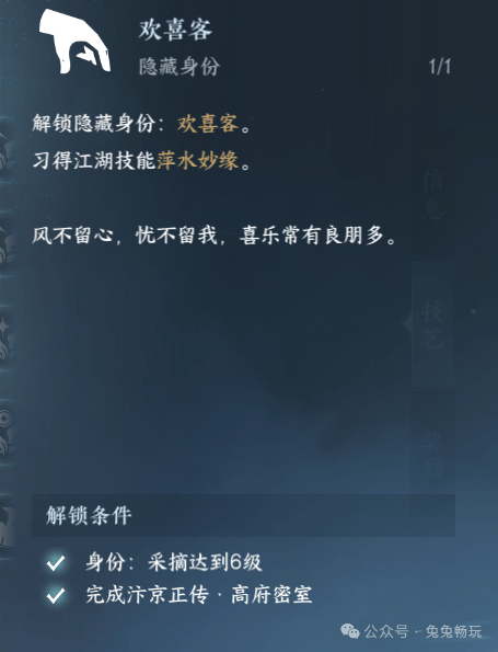 1、xxx的仰慕者,采摘的技艺中解锁欢喜客隐藏身份,然后在趣味技能里面佩戴技能萍水妙缘,对目标使用(NPC、玩家,甚至BOSS都可以使用)。使用以后概率获得一缕青丝,在背包里使用就可以获得仰慕者称号!