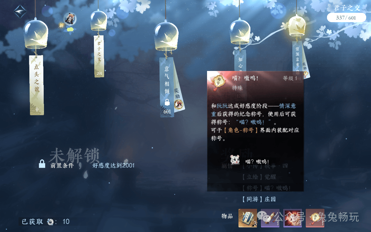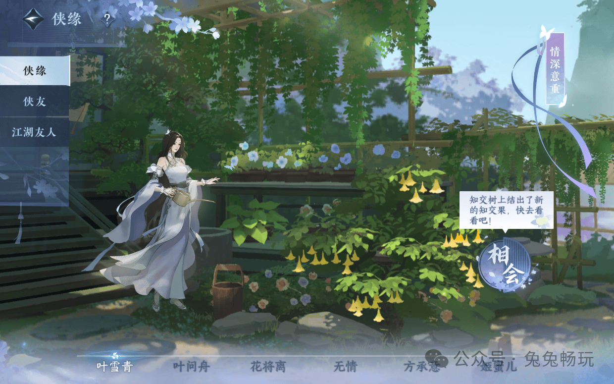首先是好感度类,瑶瑶不用猜都知道同门大部分每天的礼物基本上都是直接送给侠缘角色,忽略了侠友角色的称号。其实侠友角色的称号只需要亲密度到达情深意重(好感度2000)就可以得到,获取难度不大,并且还能领取对应的群侠技能和群侠觉醒插画技能,性价比很高!好感礼物的话同门也可以通过每天投喂小动物获得,在侠缘页面点击【相会】就可以进行投喂啦!