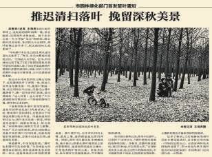 2017年,市园林绿化局下发《关于暂时保留秋冬落叶景观的通知》,要求除公园主要道路落叶要进行必要的清扫外,林地、草坪上的自然落叶尽最大可能保留,让市民感受深秋美景。(2017年11月13日《北京日报》6版,《推迟清扫落叶 挽留深秋美景》)那年初冬,各大市属公园构成一幅幅浪漫图景:朱红的枫叶、金黄的银杏叶随风飘落,散落在树下绿地、景观小径,五彩斑斓。(2017年11月17日《北京日报》10版,《周末到市属公园看“落叶缤纷”》)