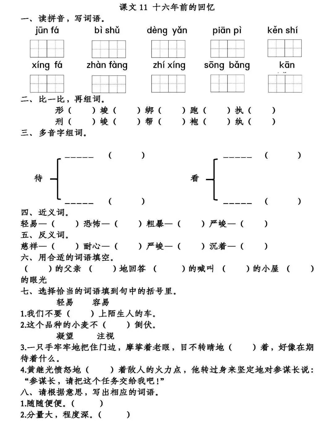 3.一只手牢牢地把住门边,摩挲着老眼,目不转睛地(凝望)着,好像在期待着什么。
