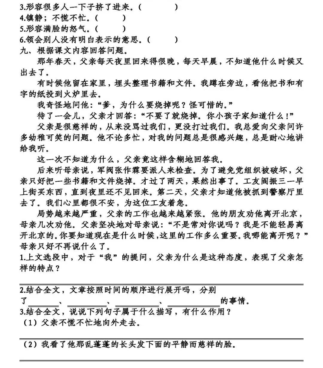 因为当时的局势十分严峻,不是同孩子谈心的时候。表现了父亲对待工作认线.结合全文,文章按照时间的顺序进行展开吗,分别写了被捕前、被捕时、法庭上、被害后的事情。