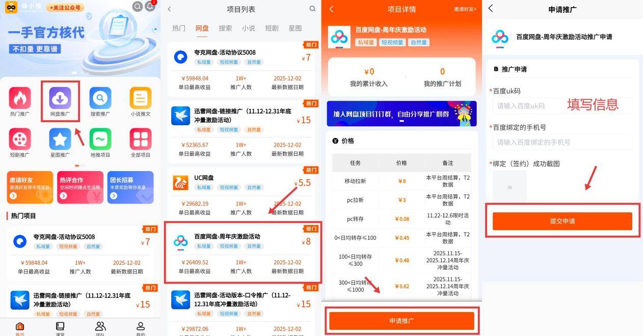 通过【蜂小推】一级服务商,找到百度网盘拉新项目入口,填写基础信息并提交推广权限申请。