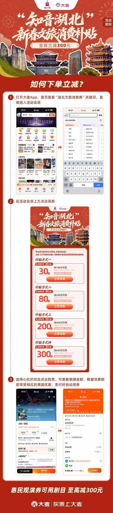 活动期间,消费者可通过在大麦App或大麦微信小程序,搜索“湖北文旅消费补贴”