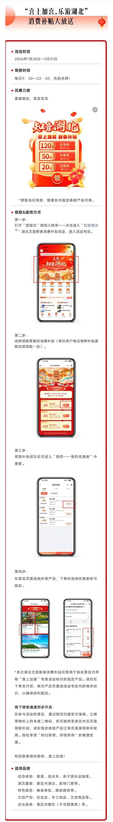 线下:在参与活动的景区内,通过微信扫描官方布置的活动海报、立牌等线下宣传物料上的二维码,直接跳转至“游湖北”平台领券页面或景区二消产品列表。