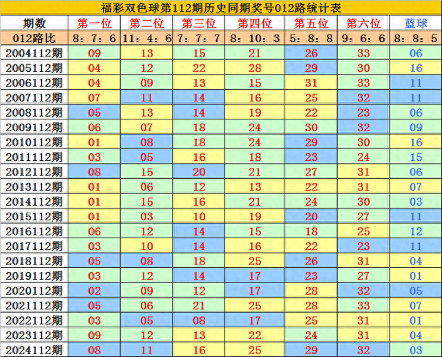 蓝球分析:第112期历史同期蓝球号码012路比开出8:8:5,在前5年同期奖号中,2路蓝球明显走冷,本期防2路蓝球再次轮空,关注蓝球09。