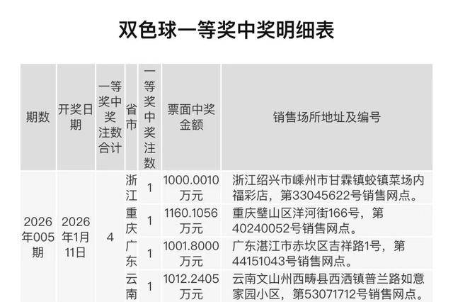 上期双色球开出4注,每注1000万,分落4地,出自浙江1000万、重庆1160万、广东1001万、云南1012万。开奖后奖池28.2亿。以下是一等奖明细: